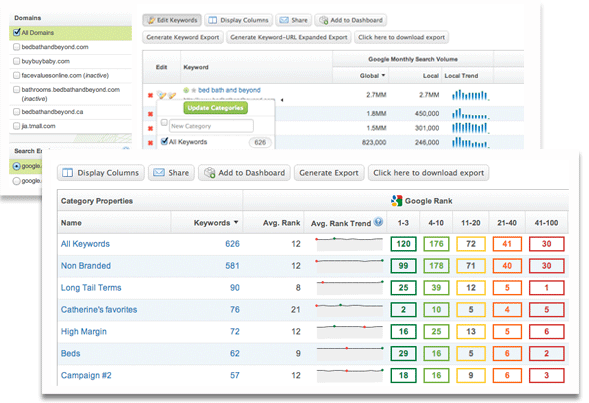 在Searchlight中,關鍵詞類目是非常靈活的,一切由你來決定如何去跟蹤。類目可以用來監控和衡量你組織的,戰術的,或者戰略的目標,而這些是以前所沒有的。在你的關鍵詞種類中,為你及競爭對手獲得詳細的洞察力,以便觀察你如何對比市場份額,關鍵詞性能,以及分析度量,并能讓你發現更多競爭者。